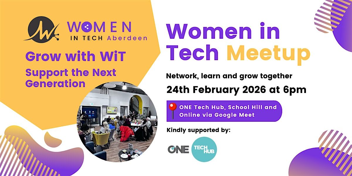 By clicking the button to submit this form, you are consenting to the information you provide being used by Women in Tech Aberdeen to contact you directly in relation to this event and future events. We will share your information with the venue to allow more efficient registration when you arrive. Please note that photographs and footage may be taken throughout the event. These may be used by Women in Tech Aberdeen for marketing, on our website and in social media.