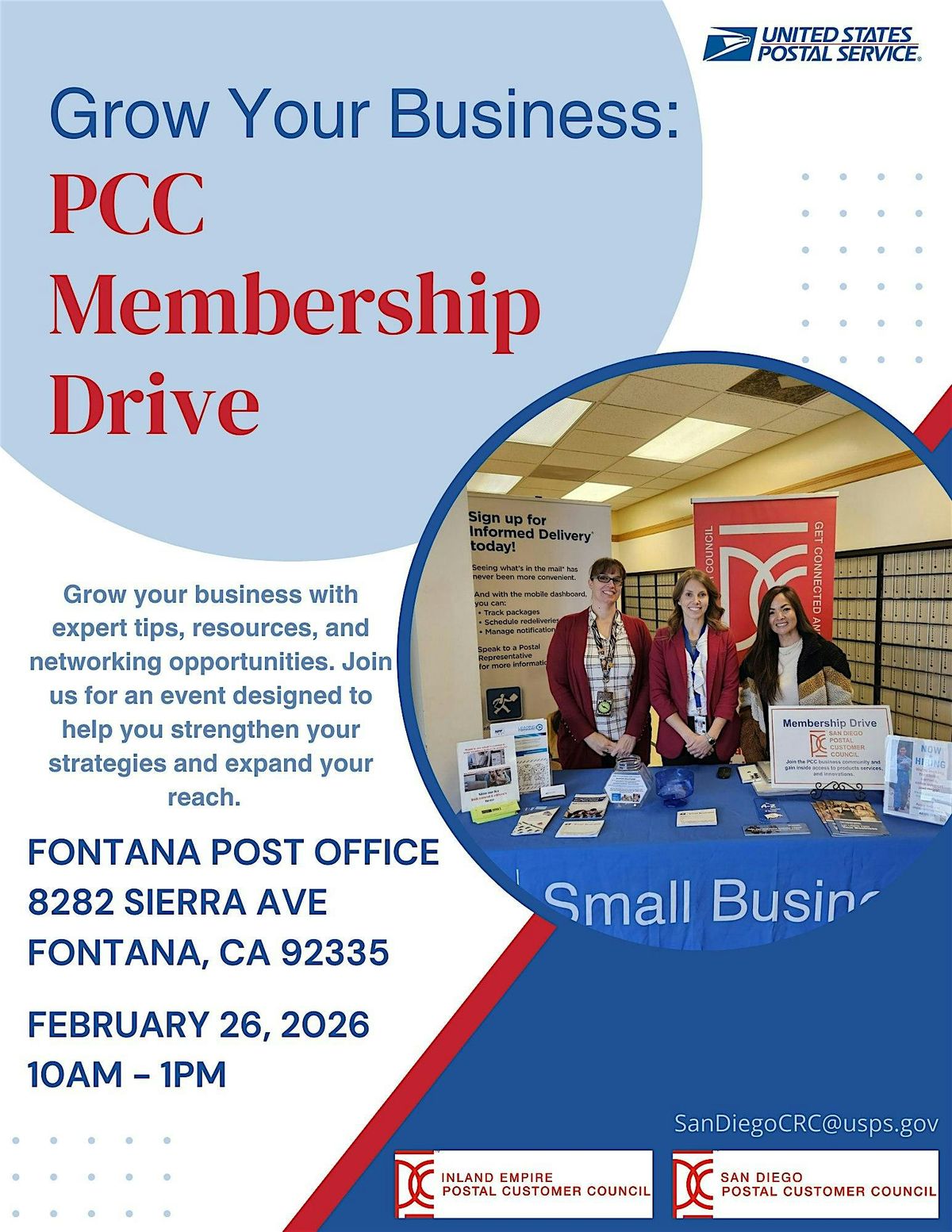 Join us in Fontana for the PCC Membership Drive & Grow Your Business Day a dynamic event designed to connect local businesses with USPS experts and industry leaders. Attendees will gain valuable insights, explore tools to expand their customer base, and discover the benefits of PCC membership. With networking opportunities and practical strategies, this event is the perfect chance to strengthen partnerships and grow your business.