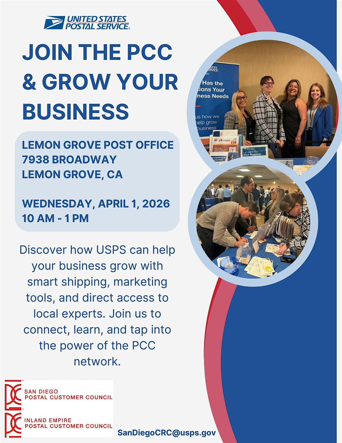 Grow your business with the support of USPS and the Postal Customer Council (PCC). This event is designed to help small business owners discover practical tools, shipping and marketing solutions, and expert insights that can strengthen customer outreach and streamline operations. Attendees will learn how the PCC connects businesses with USPS leaders, industry professionals, and a network of peers committed to collaboration and growth. Whether you're looking to expand your reach, improve efficiency, or build valuable relationships, this event offers the guidance and connections to help you move forward with confidence.