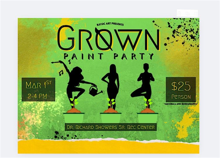 Whether you are "GrowING" or "GROWN", this is a safe space for your creativity to flourish! Everything you need to create a masterpiece will be provided - predrawn canvases, paint, and all other materials! Just bring yourself and a friend!