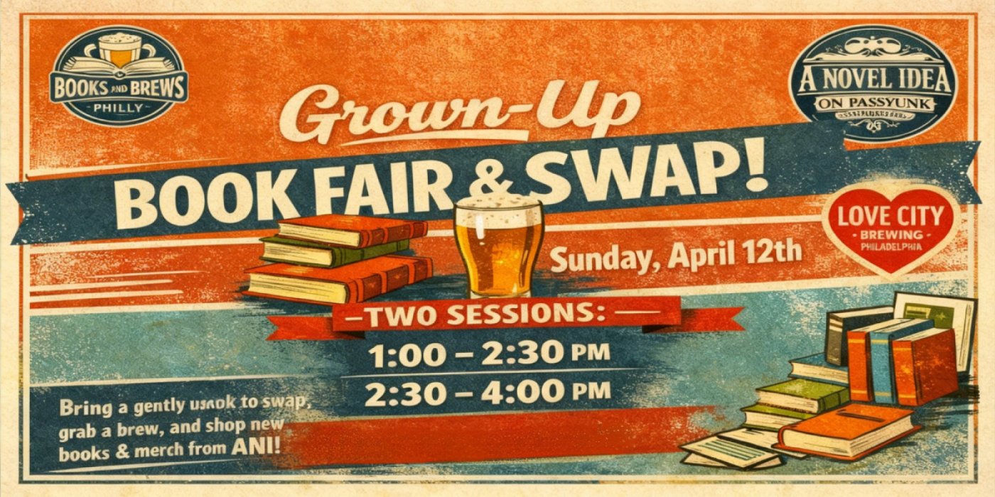 Books and Brews Philly and A Novel Idea are teaming up to bring you a book lover's dream event...a Grown Up Book Fair and Swap! Bring a gently used book (or books) to swap, sip on a beverage and shop new books, gifts and merch from ANI! Can't wait to see you there!