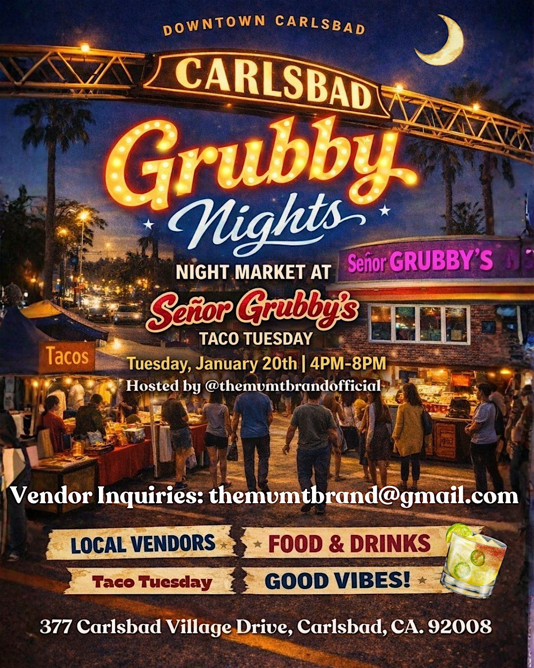 Grubby Nights brings a vibrant night market experience to Downtown Carlsbad, combining local vendors, tacos, drinks, and great vibes at Señor Grubby’s in the heart of Carlsbad Village. This Taco Tuesday gathering invites the community to shop small, eat well, and enjoy a lively evening in one of North County San Diego’s most walkable neighborhoods.
