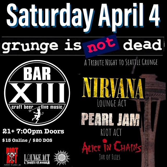 Step back into the '90s grunge revolution as Bar XIII brings you a night dedicated to the legends who shaped a generation. On Saturday, April 4, 2026 three powerhouse tribute bands will transport you straight to the heart of Seattle with the raw emotion, heavy riffs, and haunting melodies of Nirvana, Pearl Jam, and Alice in Chains.