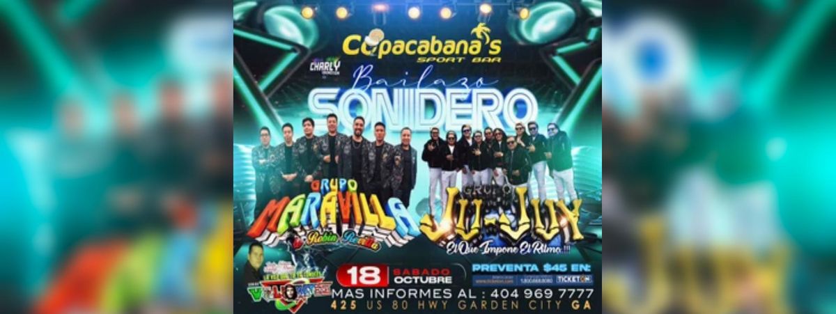 Don't miss 'GRUPO JU-JUY, GRUPO MARAVILLA & MAS', the premier exciting event happening at COPACABANAS SPORT BAR , Savannah, GA, United States. This event showcases the best talent and expertise in the field. Immerse yourself in a world of opportunities and cutting-edge ideas. Book your attendance today and be part of something extraordinary. #GRUPOJU-JUY,GRUPOMARAVILLA&MAS #event #exciting #SavannahEvents #GAEvents