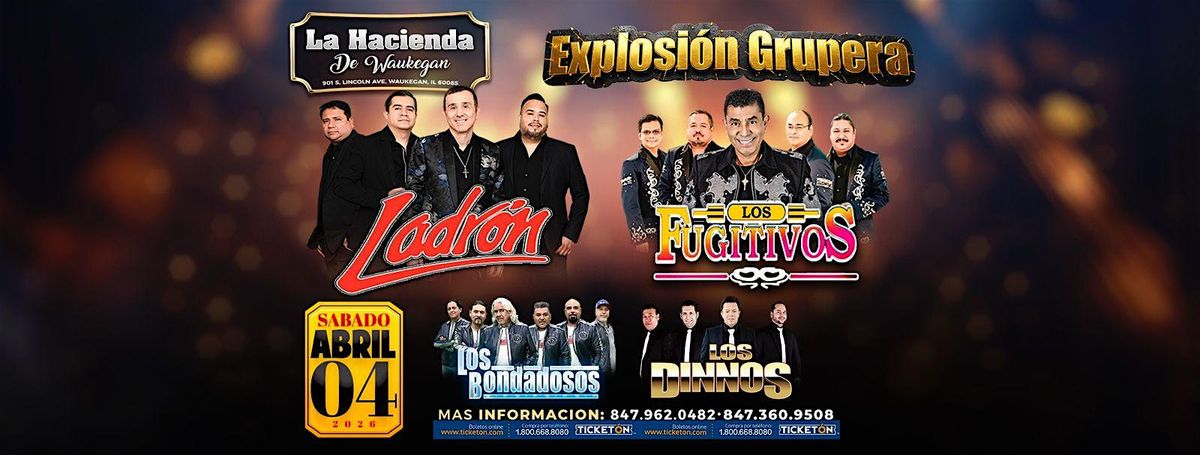 Ven a La Hacienda Del Norte el Abril 4, 2026 a las 8:00 PM (CT) para disfrutar de GRUPO LADRON, LOS FUGITIVOS, LOS BONDADOSOS y LOS DINNOS. Será una noche llena de buena música y ambiente relajado. ¡Trae a tus amigos y prepárate para bailar toda la noche!