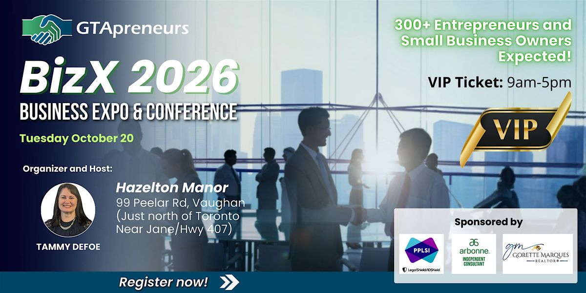 You are invited to an exciting mega networking bash! Join us on Tuesday, October 20, 2026 for GTApreneurs’ BizX 2026 Business Expo and Conference! We expect 300+ small business owners and entrepreneurs all looking to meet you and many others to do business together!