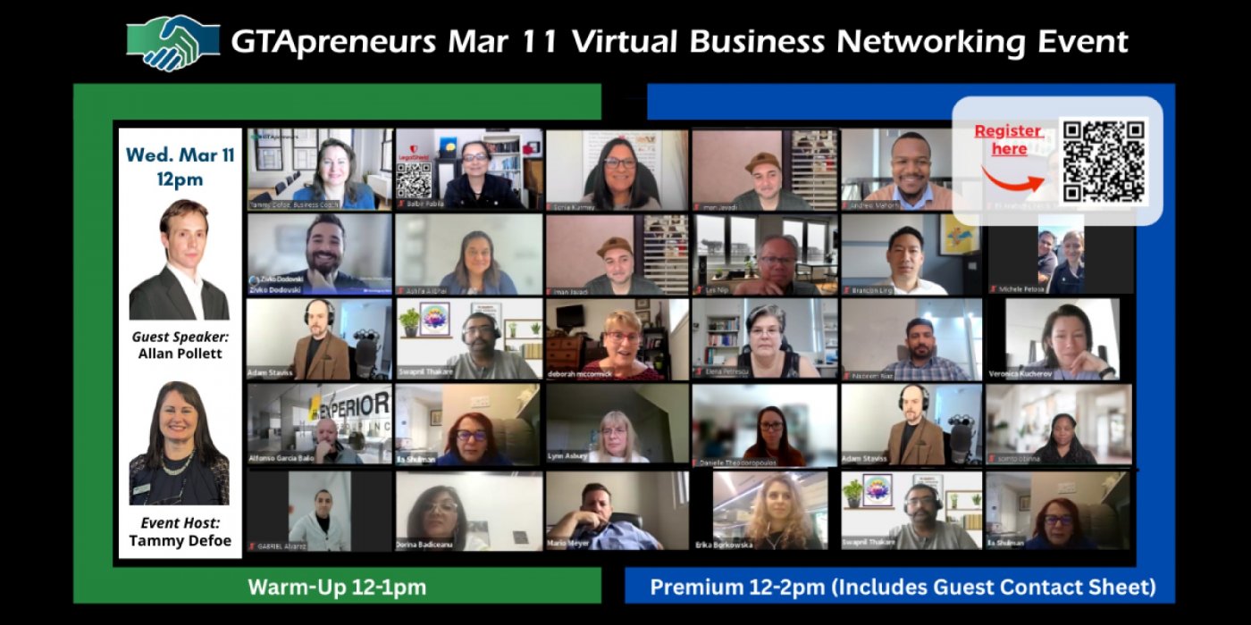 Do you want more clients? Join us for GTApreneurs March 11-2026 Afternoon Virtual Business Networking Event to connect with other amazing entrepreneurs, learn something new and promote your business!