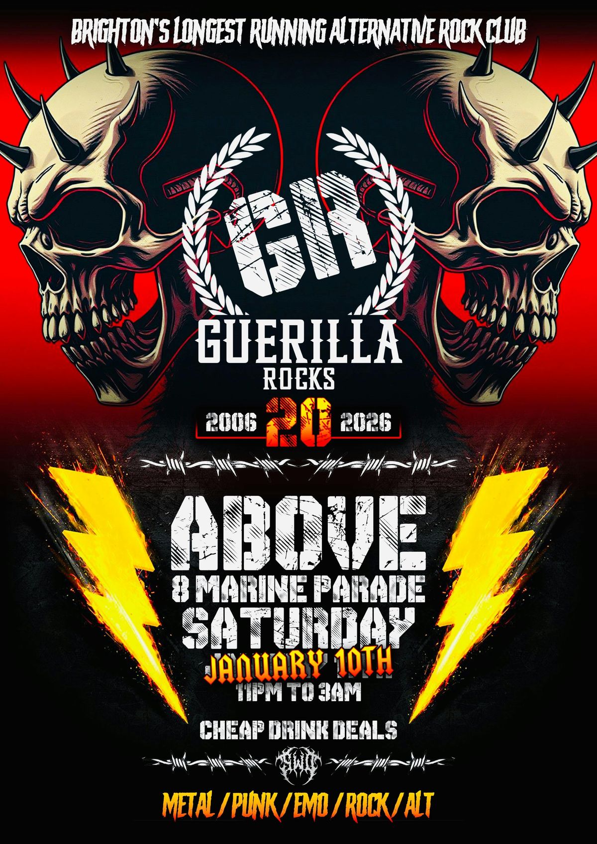 Hey folks, we're Guerilla Rocks and we've been running for nineteen years - and now we are Brighton's longest running club night (we think)!We play all your favourite Alternative/Rock/Metal/Pop-Punk and Emo tunes all night long.