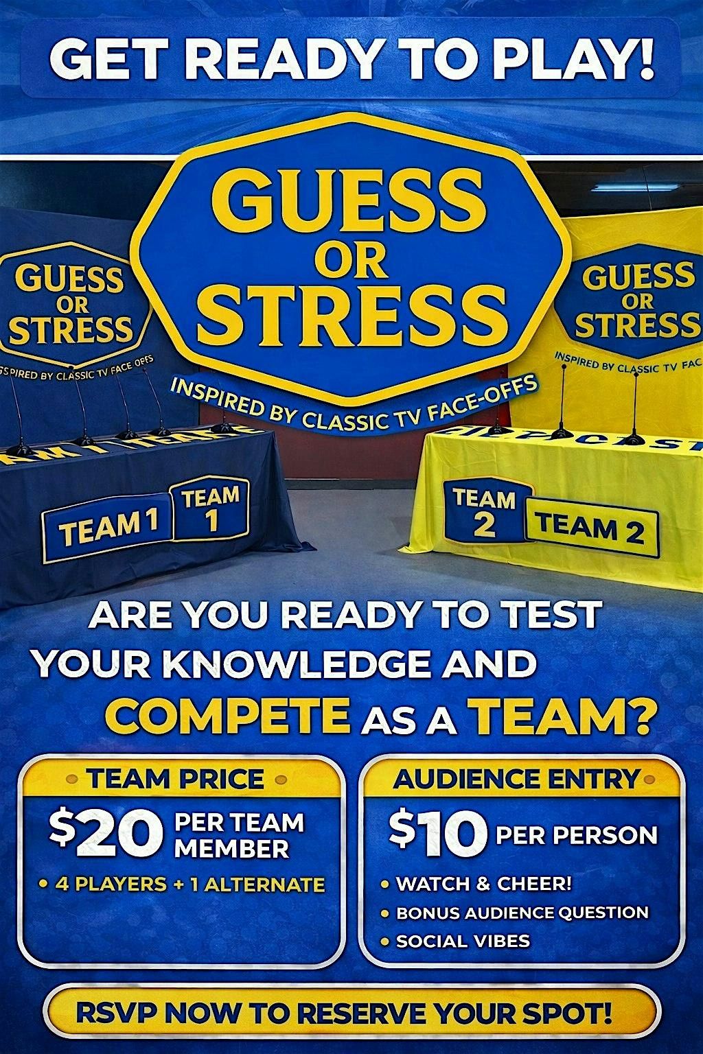 Guess or Stress is a high-energy, live game show inspired by classic TV face-offs—built for laughs, competition, and bragging rights. Whether you’re on a team or in the audience, this is not a sit-quiet-and-watch type of event.