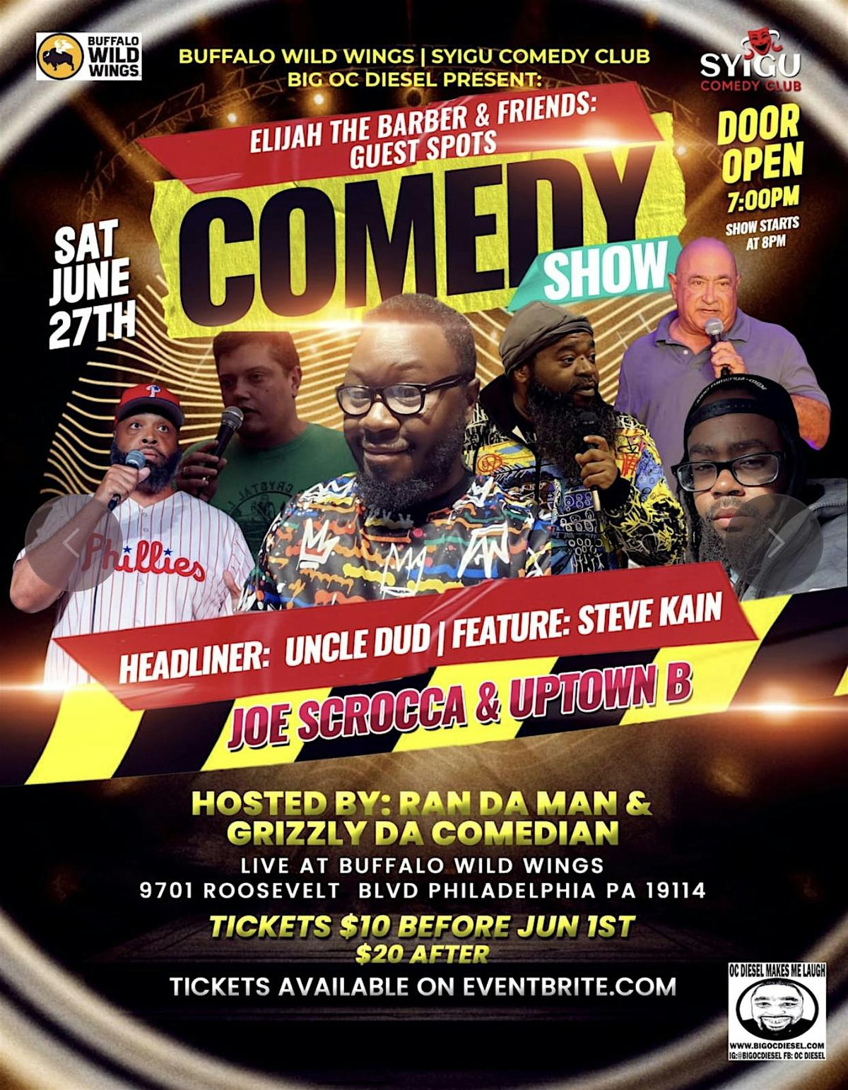 Join us Saturday, June 27th at Buffalo Wild Wings (9701 Roosevelt Blvd, Philadelphia, PA) for an unforgettable evening presented by SYIGU Comedy Club & Big OC Diesel.