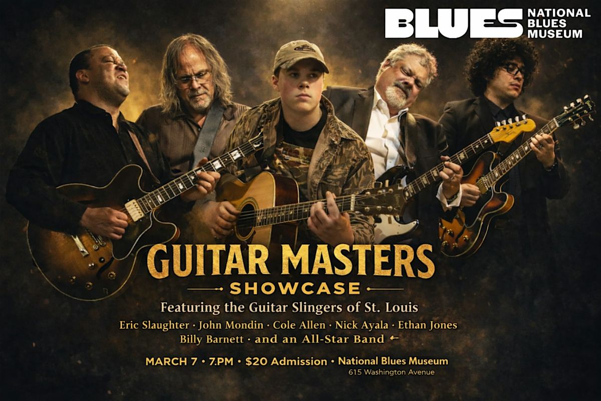 Guitar Masters Showcase featuring the Guitar Slingers of St. Louis brings together some of the area’s most respected players for a night dedicated to tone, technique, and deep blues roots.