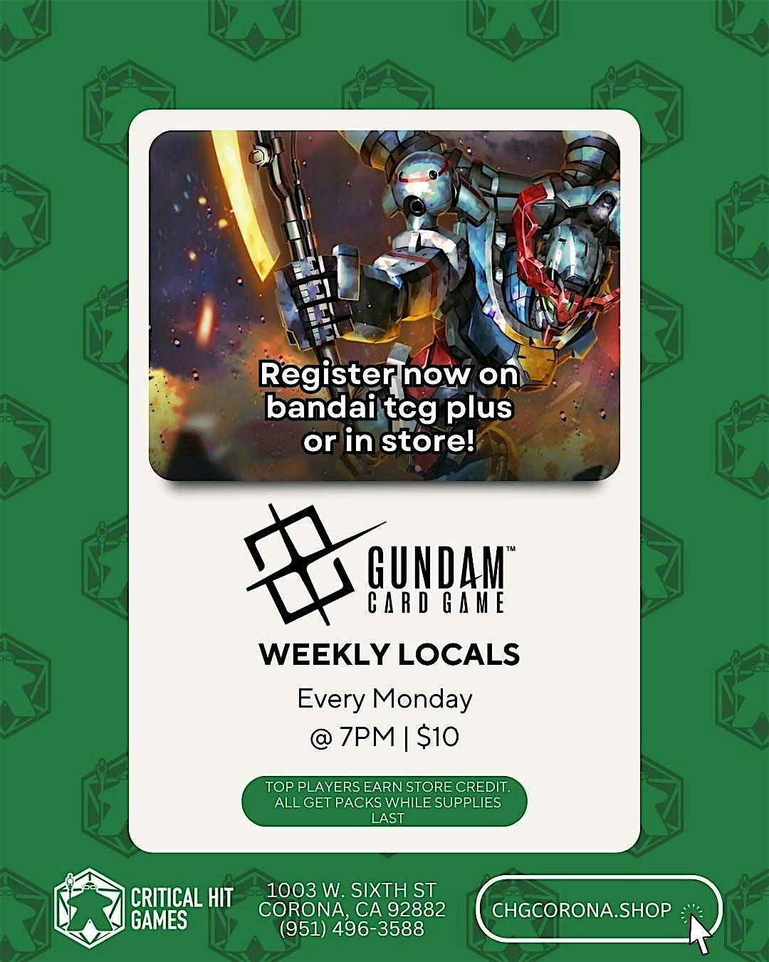 Gundam Card Game locals are happening every Monday at 7PM at Critical Hit Games. This is a great night to learn the game, test decks, and meet other players who are excited to help newer pilots get comfortable. Entry is $10, registration is available through Bandai TCG+ or in-store, and everyone receives packs while supplies last.