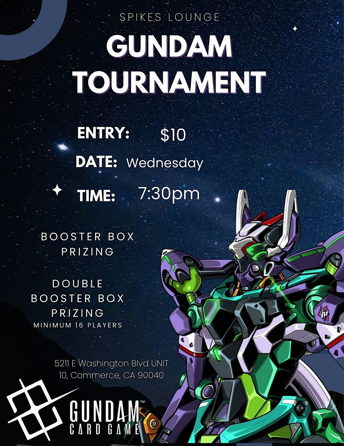 Spike’s Lounge hosts weekly Gundam Card Game Tournaments in Commerce, CA — built for players who want consistent competition, real prizing, and a strong local TCG community.