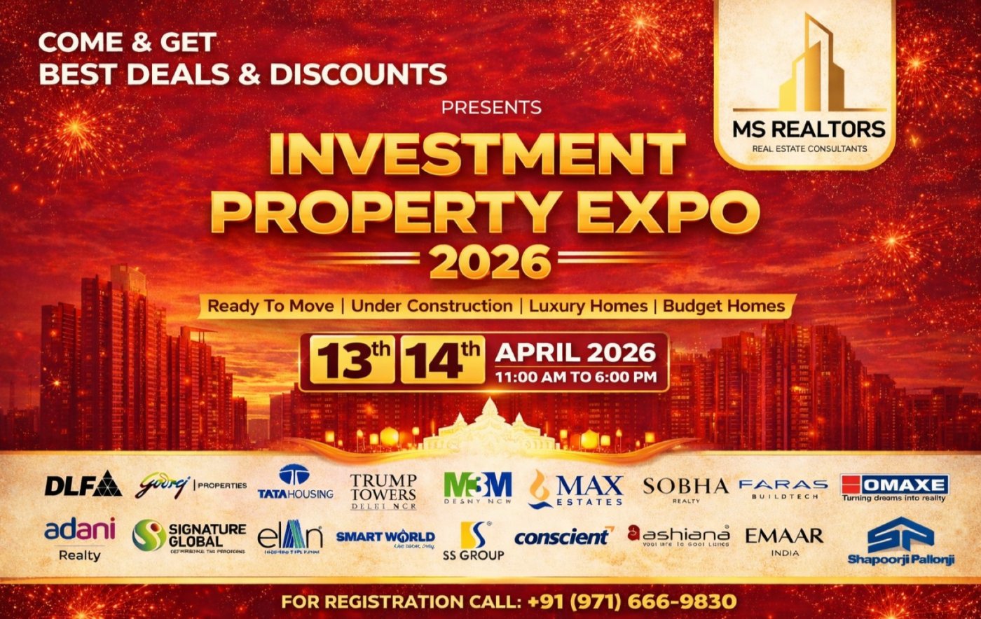 MS Realtors India presents the April investment expo — SPR corridor analysis Monday, new launch special Tuesday. DLF, M3M, Adani, Emaar and 14 more. Free entry. April 13 and 14, Vipul Trade Centre, Sector 48, Gurugram.
