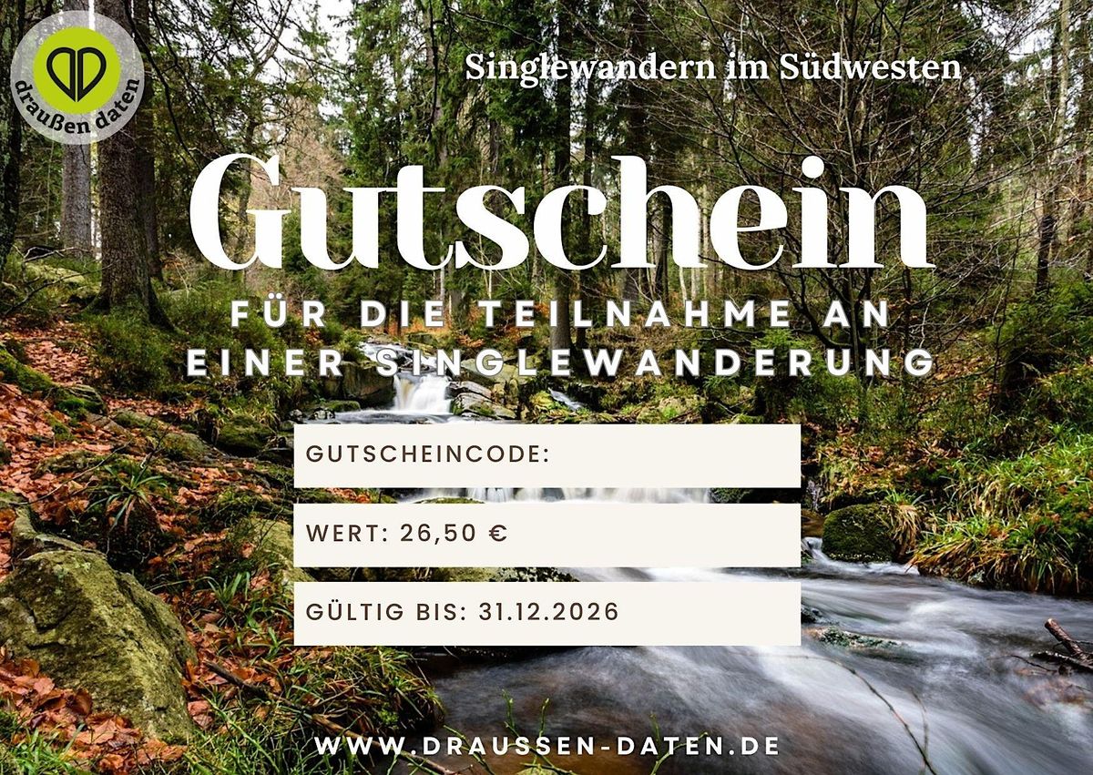 Gutschein im Wert von 26,50 €, einlösbar bei der Buchung einer Singlewanderung mit draußen daten (www.draussen-daten.de). Der Gutschein (Design wie abgebildet) kommt digital per Email und kann dann selber ausgedruckt werden.
