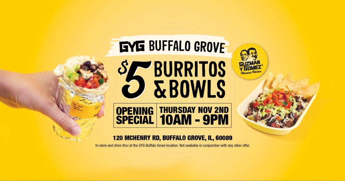 Guzman y Gomez (GYG) one of the world’s fastest-growing fast-food restaurants is opening a fourth restaurant in Buffalo Grove as expansion continues throughout Chicagoland. GYG Buffalo Grove will open on Thursday November 2nd located at 120 McHenry Road with $5 burritos and bowls opening day special from 10am- 9pm for dine-in drive-thru orders and takeout.