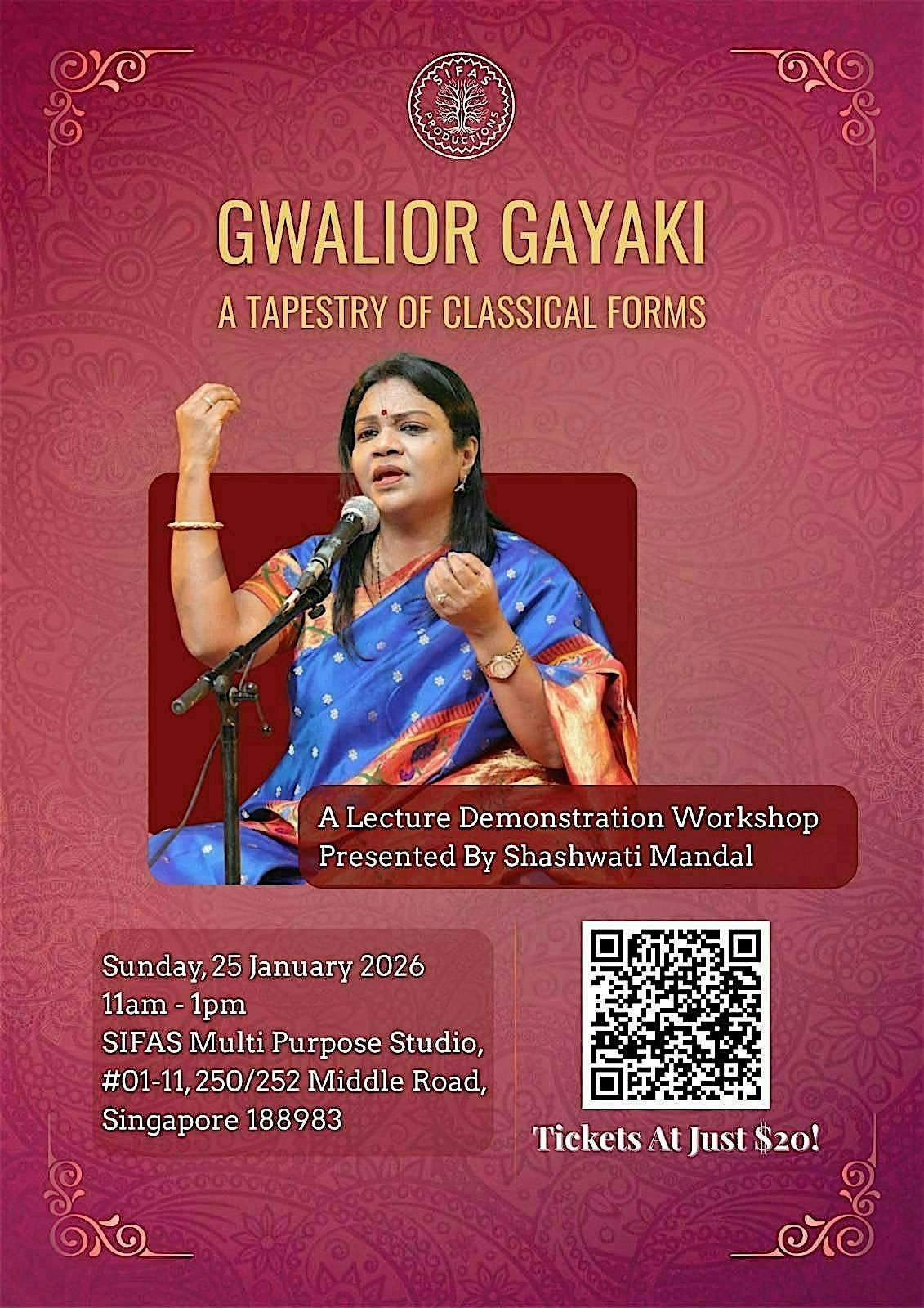 Gwalior Gayaki celebrates the timeless elegance of one of Hindustani classical music’s oldest and most revered traditions. Featuring acclaimed vocalist Shashwati Mandal, this lecture-demonstration workshop followed by a learning session, offers a rich and immersive musical experience, exploring the distinctive nuances, history, and aesthetic depth of the Gwalior gharana where folks may have an opportunity to learn a few rare gems. Register now to experience an enriching musical journey that honours a legacy which continues to inspire generations of Hindustani classical musicians.