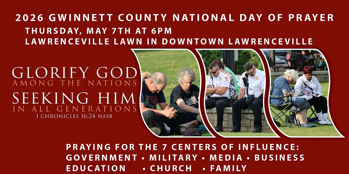 The 2026 Gwinnett County National Day of Prayer will be held on Thursday, May 7, at 6:00 p.m. at the Lawrenceville LawnAbout this Event