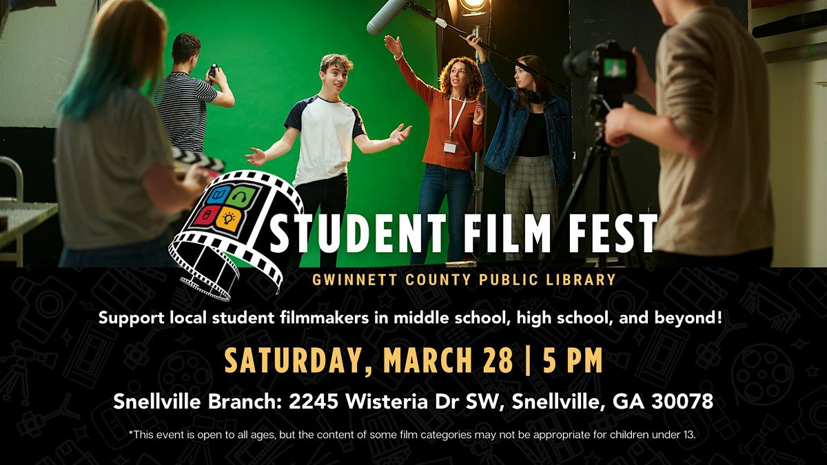 Hey movie buffs! Join us in person at the Gwinnett Library Student Film Fest to catch some awesome flicks made by middle school, high school, and college students. See the films from 5 to 8 pm, meet the filmmakers, and celebrate their creativity. Find out the winners at 8 pm at the awards show! Don't miss out on the fun and inspiring stories brought to life on the big screen!