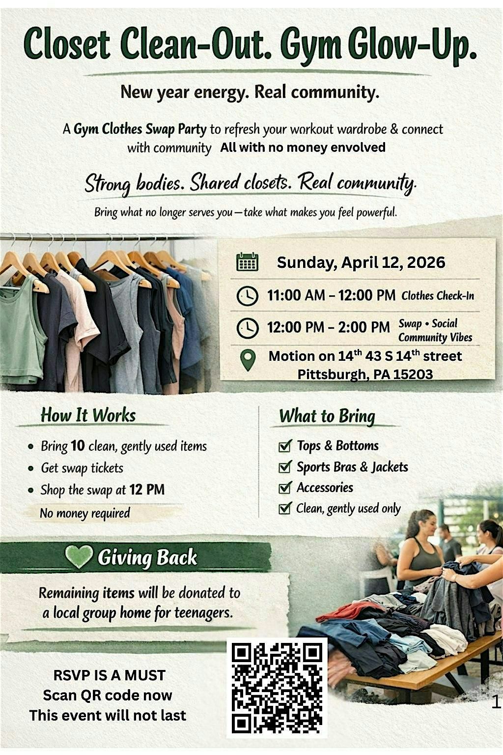 Ready to refresh your workout wardrobe without breaking the bank? Join us for a fun in-person Gym Clothes Swap! Bring your gently used gear and trade with others to score some fresh styles. It’s a great way to stay sustainable and meet fellow fitness lovers. Don’t miss out on this casual, friendly event perfect for anyone who wants to update their gym look and share some smiles.