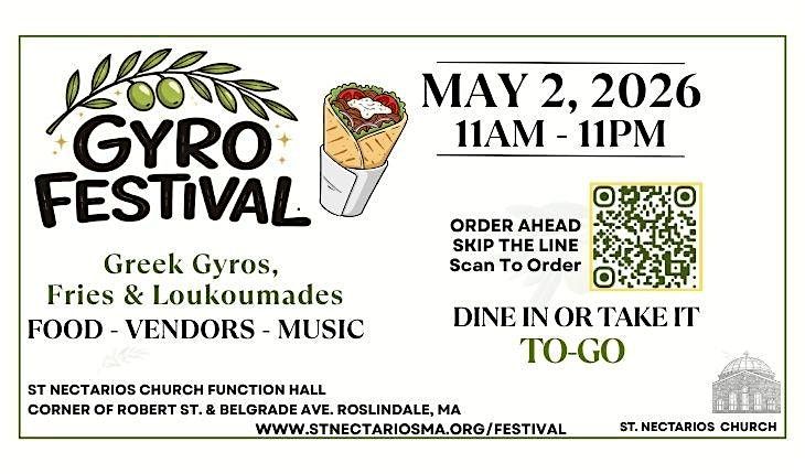 Mark your calendars for Saturday, May 2, 2026, from 11:00 AM to 11:00 PM, and experience a full day of authentic Greek GYRO-WRAPS.