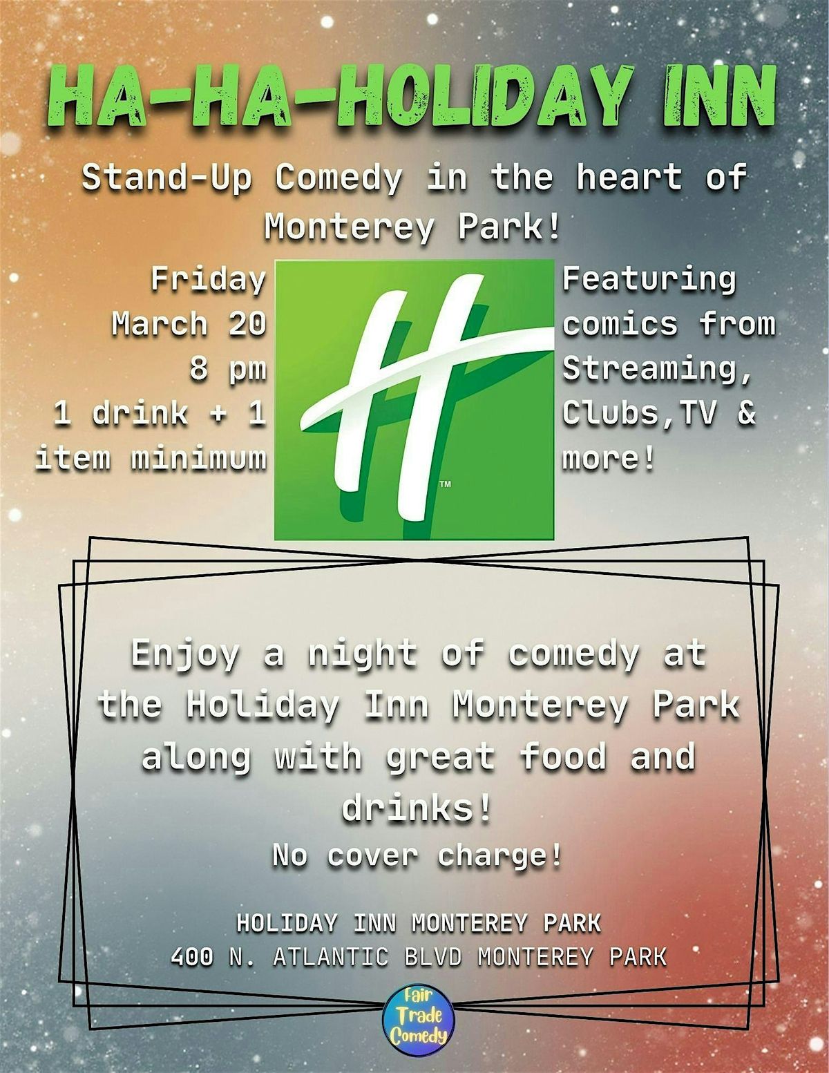 Comedy returns to the heart of Monterey Park with the Ha-Ha-Holiday Inn Comedy Show, just in time for Valentine's Day! Come out and watch comedians you've seen on TV, Streaming, Comedy Clubs and touring the country!