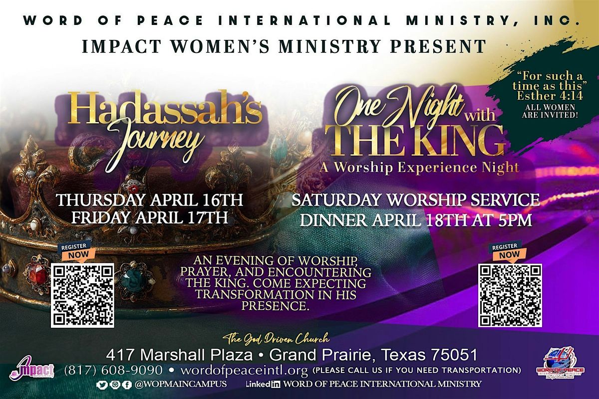 The Word of Peace Impact Women's Ministry welcomes all ladies to see how Queen Esther journey's towards her "One Night with the King!"