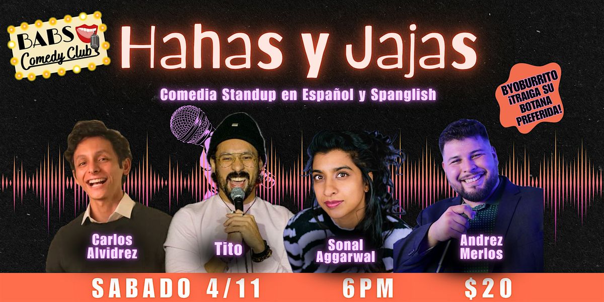¡Este mes, nuestro cartel incluye a los comediantes Carlos Alvidrez, Tito, Sonal Aggarwal y Andrez Merlos!