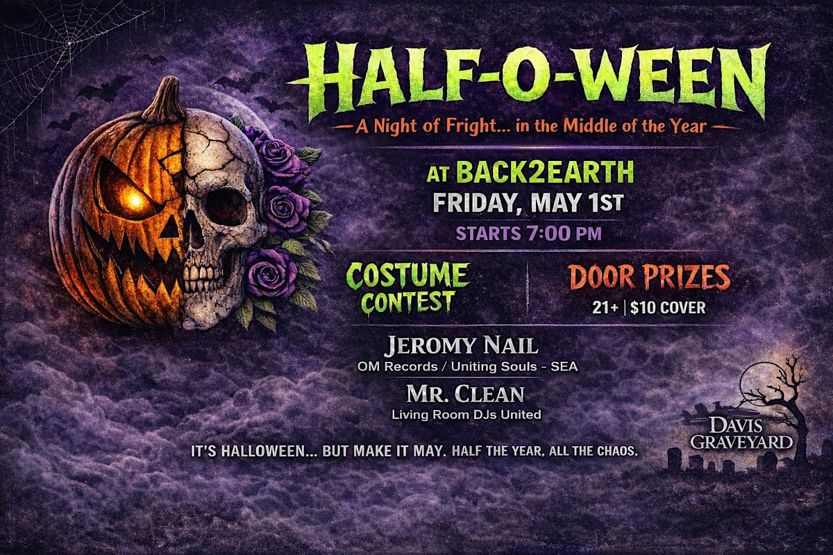 Join us at Back2Earth on May 1, 2026 at 8:00 PM for HALF-O-WEEN! All the fun of halloween without dressing for a blizzard, unless that's part of your costume, then bundle up! Costume contest, door prizes, questionable decisions. What more could you ask for?