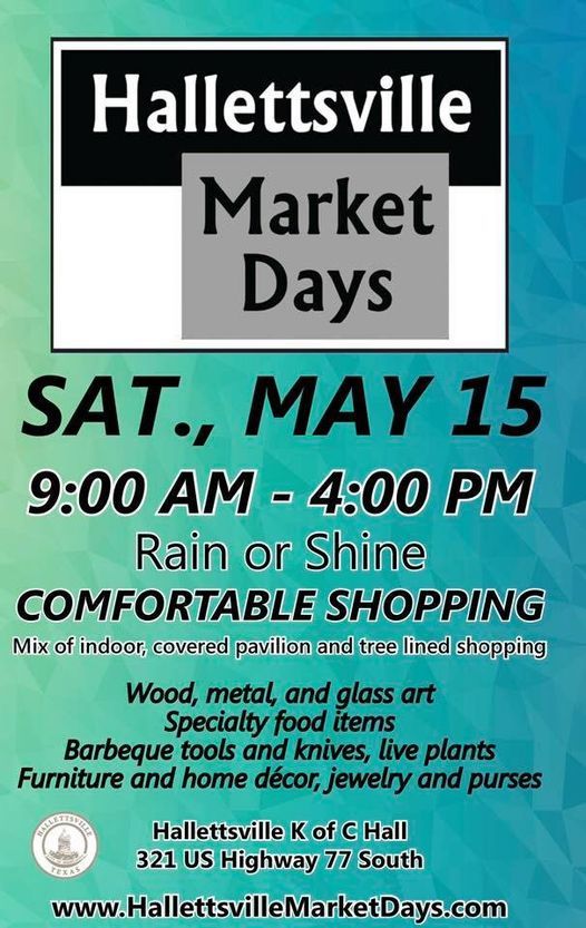 Come join just rain or shine at Hallettsville Market Days on Saturday, May 15th from 9:00 AM to 4:00 PM. We have a mix of indoor, covered pavilion and tree lined shopping. You won’t want to miss this event or your chance to score some really neat and unique items. We have a lot of talented and creative makers and vendors! We have wood, metal, glass and ceramic art, specialty food items, jewelry, purses, clothes, live plants, furniture, home decor and more... We also still have a few booth spots available, so contact us today to reserve your spot!