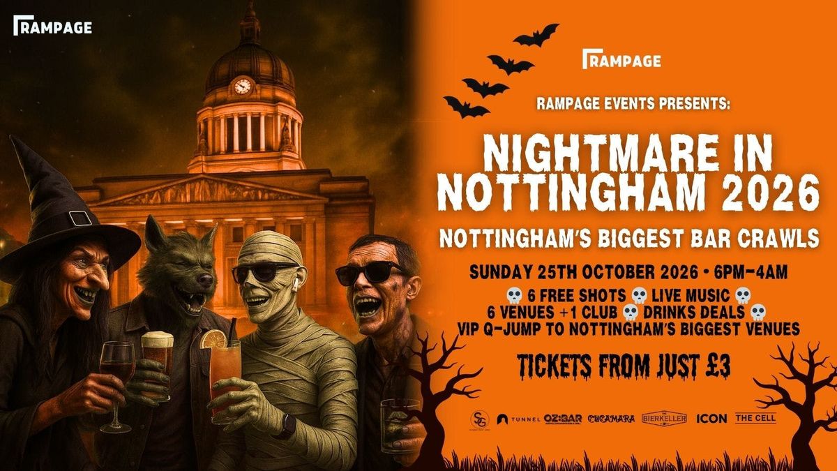 RAMPAGE EVENTS PRESENTS: HALLOWEEN BAR CRAWL - NIGHTMARE IN NOTTINGHAM 2026! 6 BARS | 6 FREE SHOTS | 1 CLUB: THE CELLAfter the success of our St Patricks day bar crawls & Halloween bar crawls, we bring you another sell out bar crawl in Nottingham! (Check out our last bar crawl video: @rampageeventsuk)