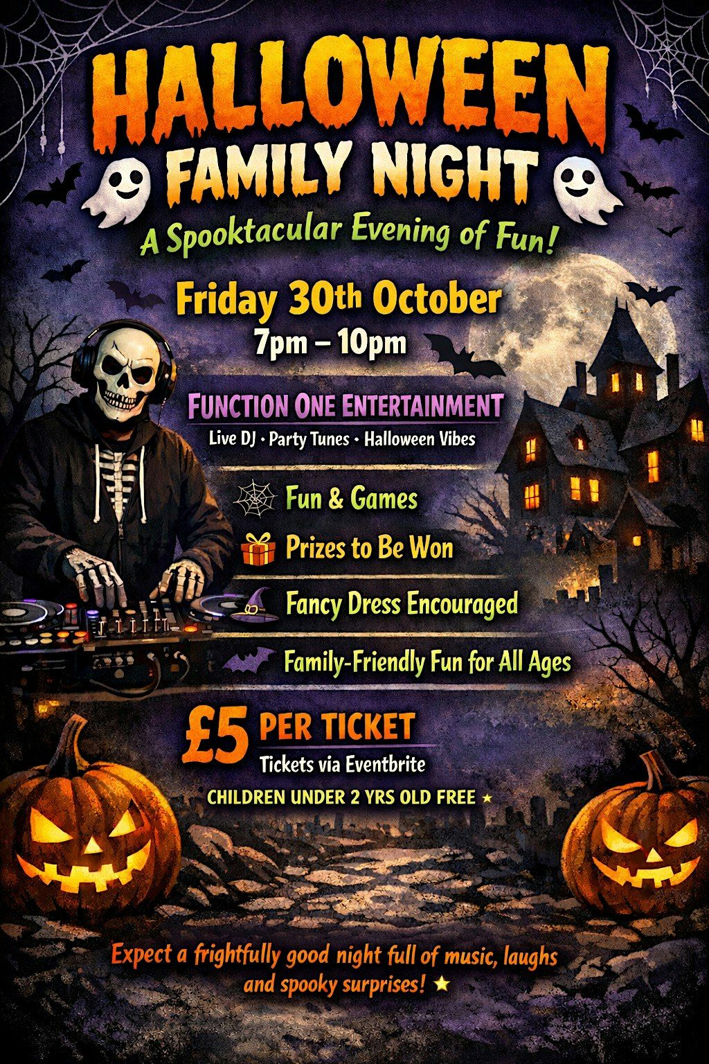 Spooktacular evening with Function One Entertainment! 7pm-10pm. Fancy dress encouraged! Games & prizes to be won! £5pp. Under 2yo FREE