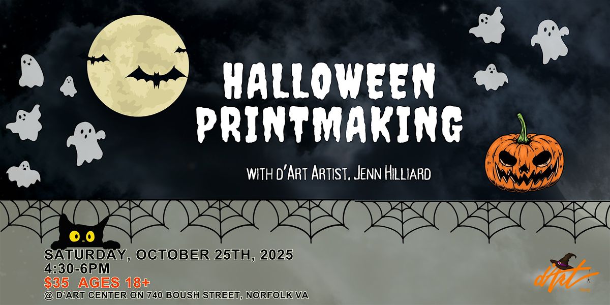 Come create some spooky seasonal prints in this Halloween-themed workshop! Led by d'Art Artist Jenn Hilliard, she will guide participants through the process of printmaking during this intriguing and unique session.