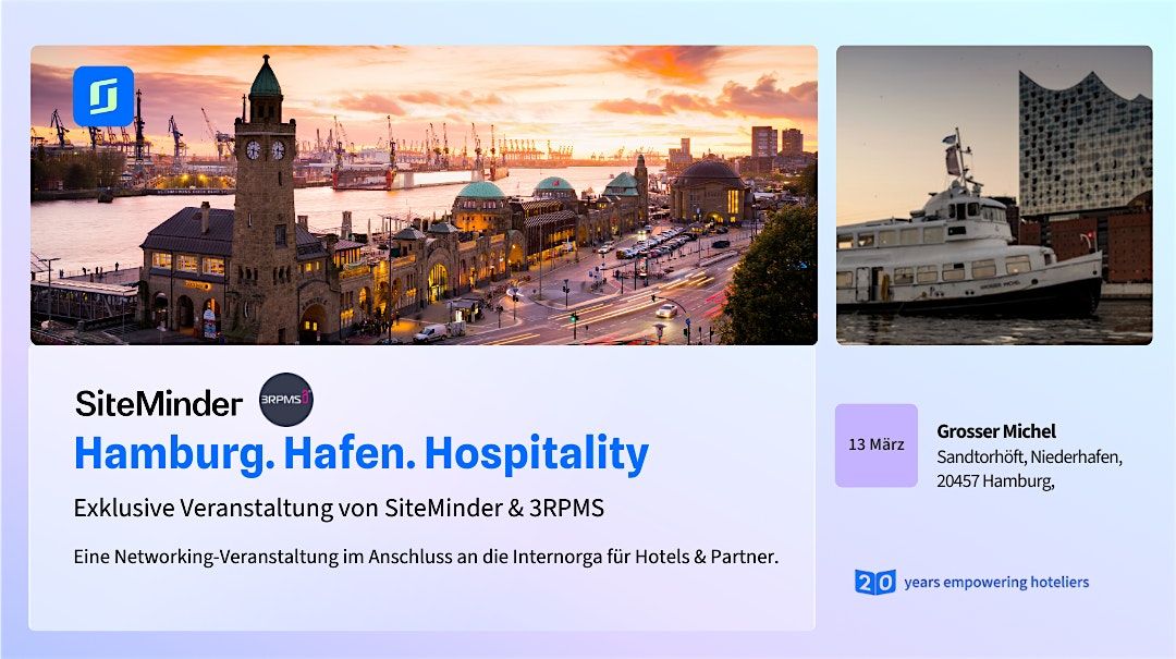 SiteMinder und 3RPMS begleiten Hoteliers weltweit mit innovativen Lösungen - jetzt laden wir Sie zu einem exklusiven Abend an Bord des traditionsreichen Eventschiffs „Großer Michel" in Hamburg ein.