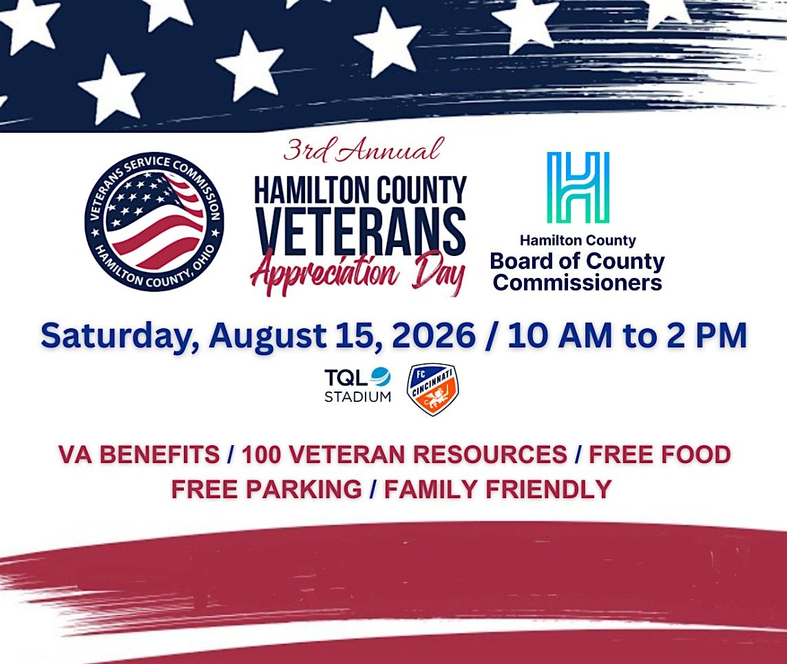 Join us in person at TQL Stadium, home of Cincinnati's very own FC Cincinnati, to celebrate and honor our local heroes at the Hamilton County Veterans Appreciation Day. It’s a fantastic opportunity to show gratitude, connect with fellow community members, and enjoy a day filled with respect and recognition for our veterans. This year's event is also extra special because it's the 250th birthday of the United States! The day will include on-the-spot resources for veterans and their families with info about filing for claims and benefits and much more. Don’t miss out on this heartfelt event dedicated to those who’ve served!