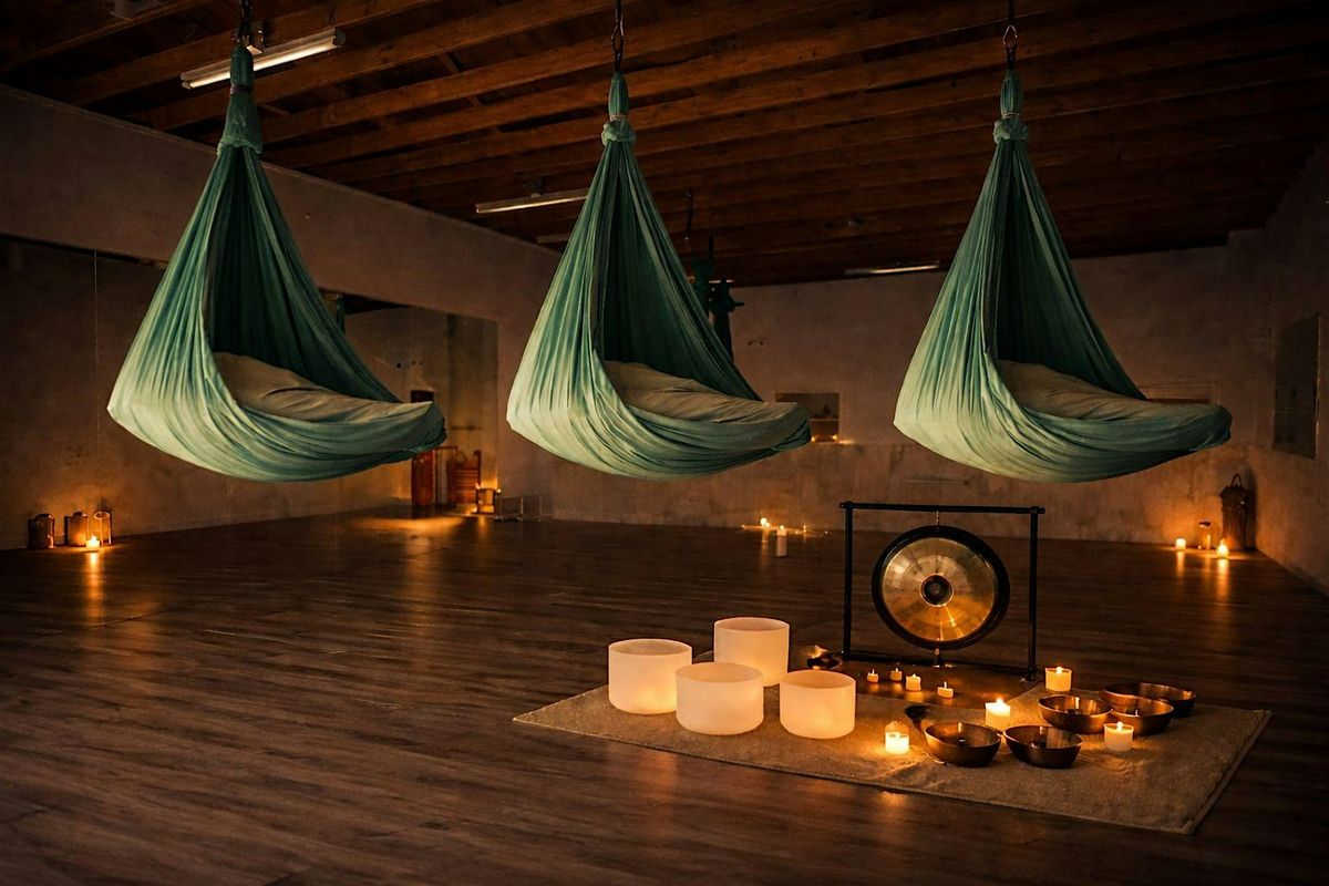 The combination of aerial hammock suspension and immersive sound creates a powerful reset for the body and mind.