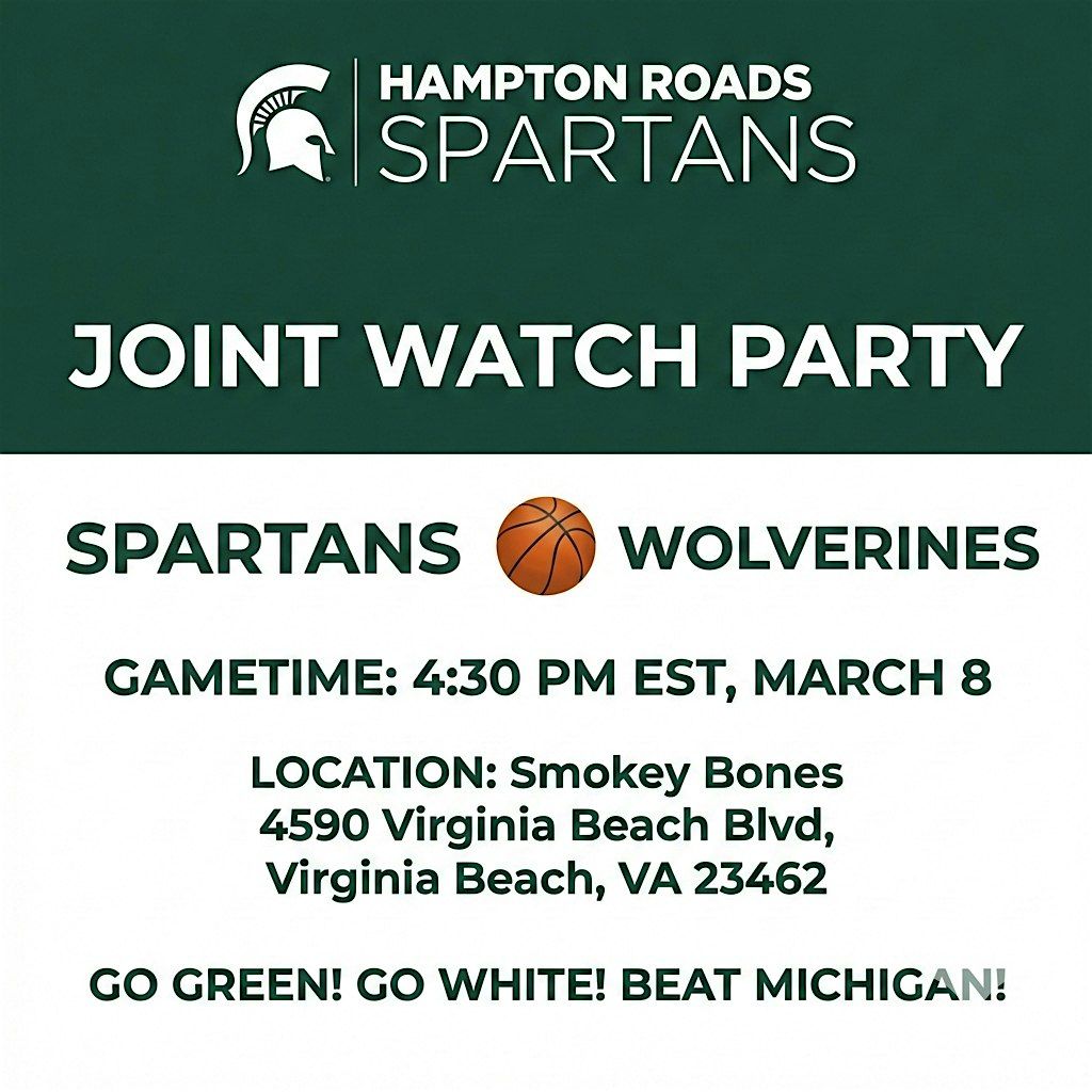 Spartan alumni, it's time to bring the energy! We’re teaming up with the Tidewater Wolverines for a joint game watch party, but make no mistake—we want to see a sea of Green and White! As we ramp up for March Madness, there is no better time to pack the house, show our Spartan pride, and cheer our guys to victory against our biggest rivals.