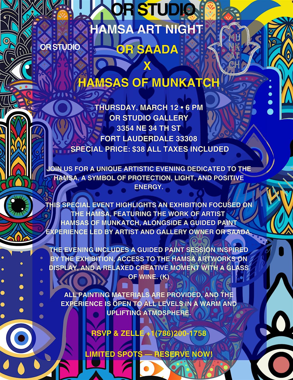THIS SPECIAL EVENT HIGHLIGHTS AN EXHIBITION FOCUSED ON THE HAMSA, FEATURING THE WORK OF ARTIST HAMSAS OF MUNKATCH, ALONGSIDE A GUIDED PAINT EXPERIENCE LED BY ARTIST AND GALLERY OWNER OR SAADA