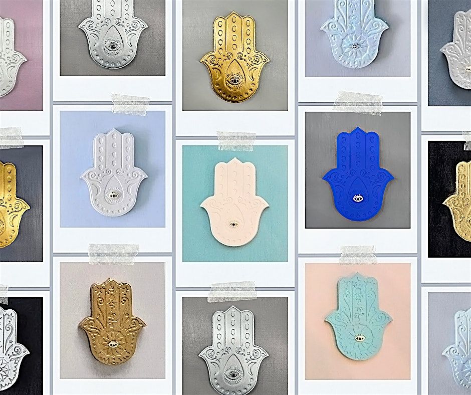 During the workshop, each participant will work with a curated set of high-quality materials, including a wooden board base and a sculptural 3D cement Hamsa that serves as the centerpiece of the design. A decorative eye jewel will be incorporated for both symbolism and visual impact. All paints, tools, and decorative materials are provided, along with clear, hands-on instruction throughout the process—making the experience approachable, engaging, and creatively fulfilling.