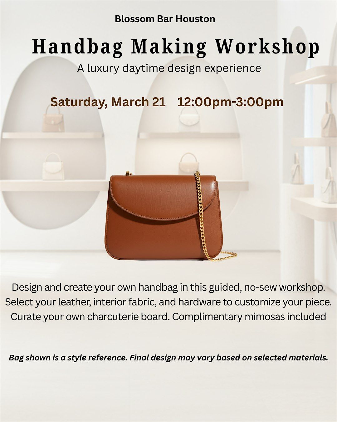 Handbag Making Workshop is a luxury daytime design experience inside the elevated aesthetic of Blossom Bar Houston.