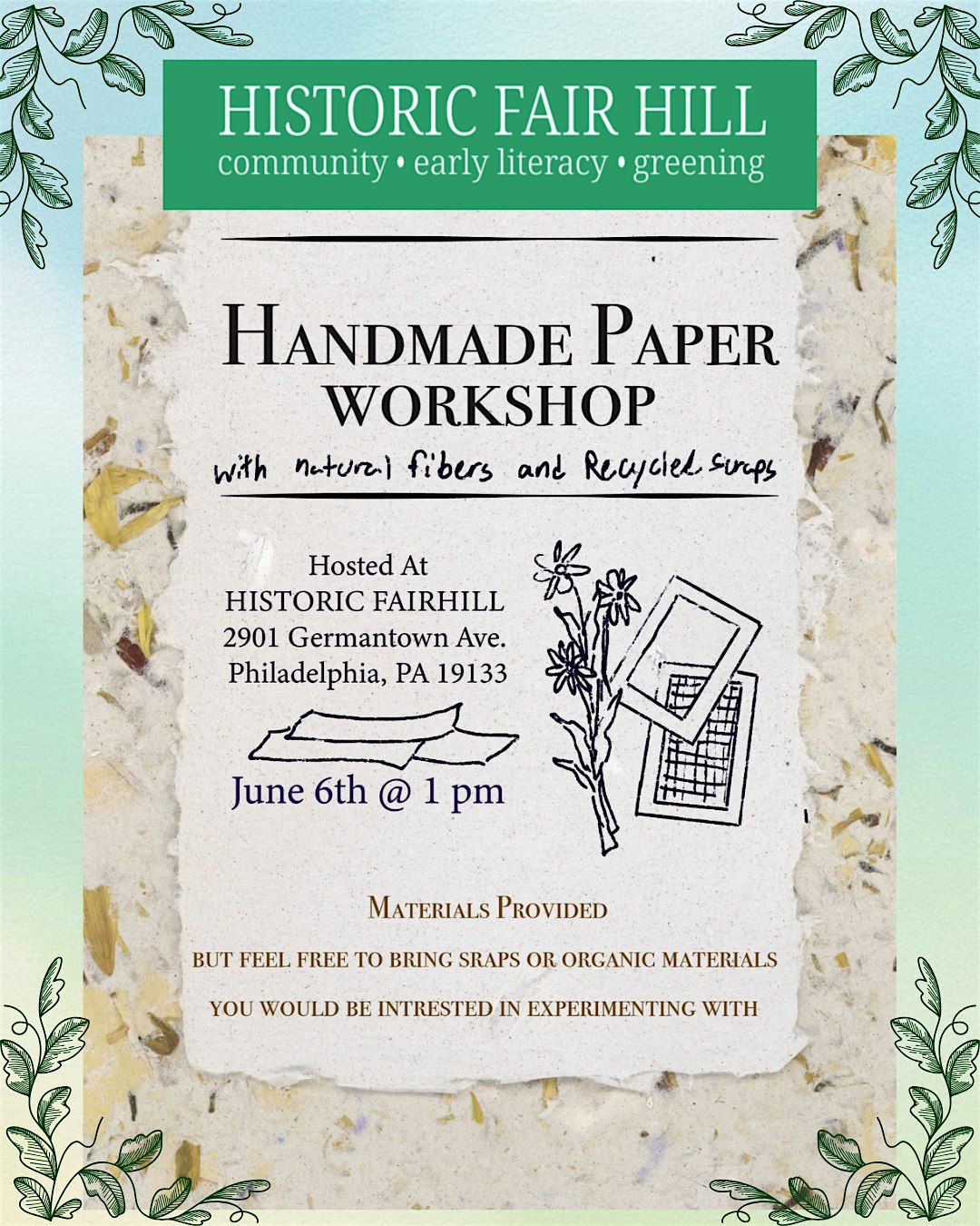 Create handmade papers using natural fibers and recycled materials in this hands-on workshop. All materials included.