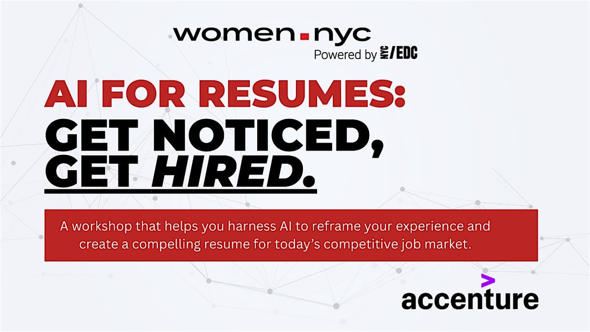 Women.NYC and Accenture are hosting a hands-on, beginner-friendly workshop designed to help you use AI as a career tool, not a shortcut. You’ll learn how to work alongside AI to strengthen your resume, clarify your experience, and tell your professional story with more confidence and intention.