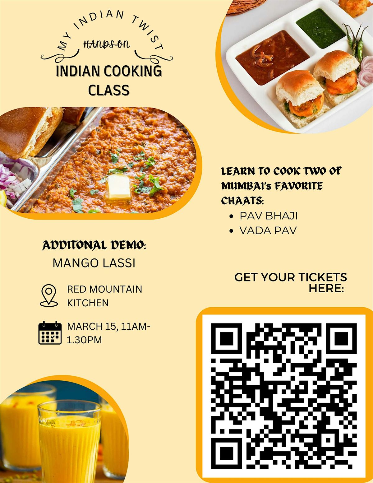 Bring the vibrant street food culture of Mumbai to life in this exciting, hands-on Chaat Special at Red Mountain Kitchen! Join a passionate home chef as you dive into the bold, tangy, and irresistible flavors that make Mumbai’s street food scene unforgettable. In this immersive class, you’ll learn to create two of the city’s most beloved chaat favorites—Pav Bhaji and Vada Pav—plus enjoy a special demo of refreshing Mango Lassi.