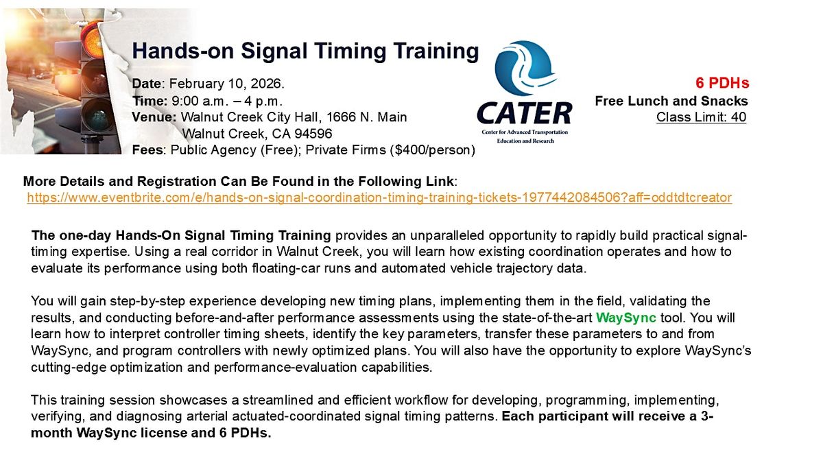 Join us for an interactive, in-person session where you'll dive into the essentials of signal coordination and timing techniques. Perfect for all-levels of traffic engineers, this training offers an unparalleled opportunity to rapidly build practical signal-timing expertise. Using a real corridor in Walnut Creek, you will learn how existing coordination operates and how to evaluate its performance using both floating-car runs and automated vehicle trajectory data. You will gain step-by-step experience developing new timing plans, implementing them in the field, validating the results, and conducting before-and-after performance assessments using the state-of-the-art WaySync tool. You will learn how to interpret controller timing sheets, identify the key parameters, transfer these parameters to and from WaySync, and program controllers with newly optimized plans. You will also have the opportunity to explore WaySync’s cutting-edge optimization and performance-evaluation capabilities.