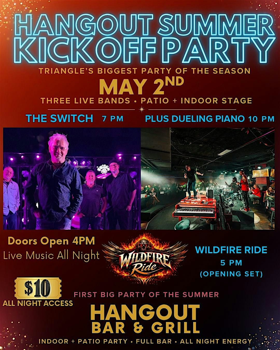 Kick off summer at Hangout Bar & Grill in Cary with one of the Triangle’s biggest live music parties. Enjoy three live bands, a high-energy dueling pianos show, and nonstop entertainment across indoor and patio stages. With a packed dance floor, full bar, and electric crowd, this is the perfect night out to start the season. Upgrade your experience with reserved tables or VIP seating—limited availability. Grab your tickets early and don’t miss it!
