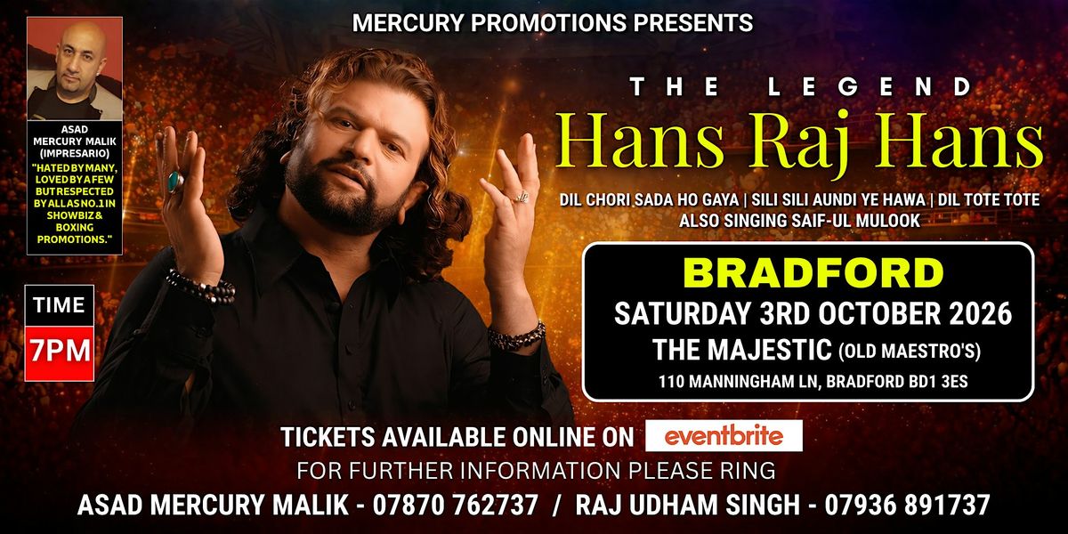 Get ready, Bradford! Experience an unforgettable evening with Padma Shri Hans Raj Hans, the legendary voice of Punjab. One of the most celebrated and globally renowned artists in Punjabi music, he will perform his timeless hits live on stage.
