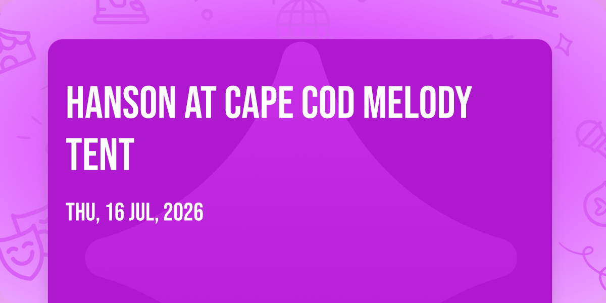 🎉 Welcome to Hanson at Cape Cod Melody Tent, where the impossible becomes possible and dreams take flight! 🏛️ Join us at Cape Cod Melody Tent in the heart of Hyannis, MA for an event that will redefine your expectations. 📅 On July 16th, 2026 at 08:00 PM, witness the transformation of space and time into something truly magical. ✨ It's a curated experience combining the best of innovation, entertainment, and community spirit, creating moments that will be remembered for years to come. Whether you're a first-time visitor or a seasoned enthusiast, prepare to be amazed. 🎊 Book now to ensure your place in this unforgettable experience!