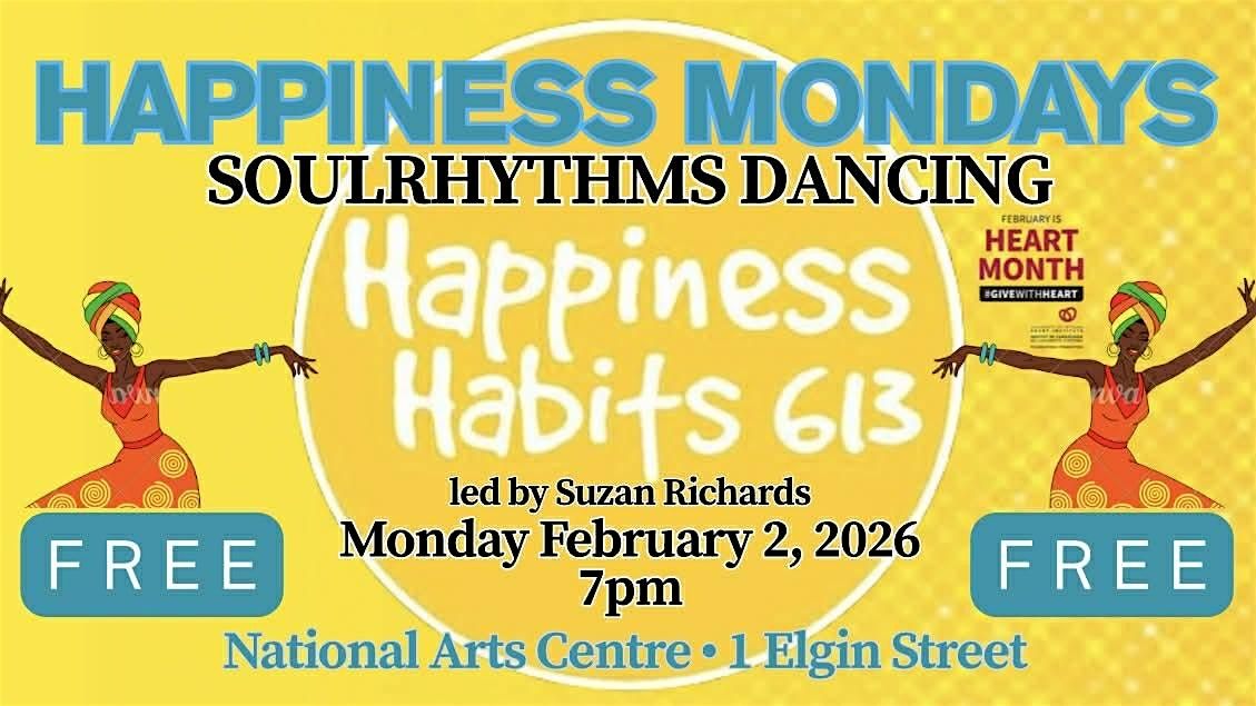 WAIVER (please read in full): In consideration of your acceptance on Eventbrite and your participation in Happiness Habits 613 events, you hereby release and covenant not to sue Happiness Habits 613, SoulRhythms, the National Arts Centre and/or its leaders, for any and all present and future claims resulting from ordinary negligence and inherent risk during the Happiness Habits 613 events, including but not limited to, any loss, injury, damage or liability sustained by you. You acknowledge that physical exercise can be dangerous and involve risk of serious injury, paralysis and/or death. You hereby acknowledge and agree to assume responsibility for all the risks, whether identified herein or not, even those risks arising out of negligence of the release. Your participation is purely voluntary. You assume full responsibility for yourself for any bodily injury.