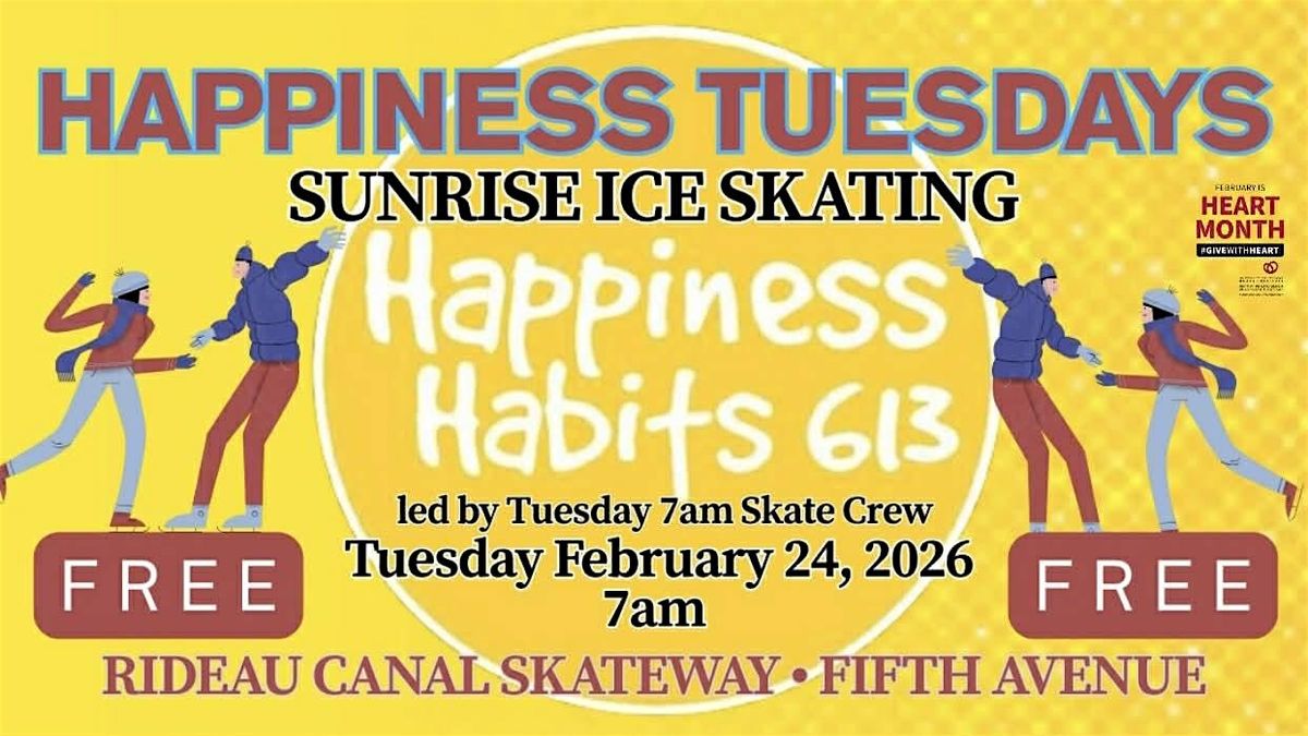 WAIVER (please read in full): In consideration of your acceptance on Eventbrite and your participation in Happiness Habits 613 events, you hereby release and covenant not to sue Happiness Habits 613, Tuesday 7am Skate Crew, and/or its leaders, for any and all present and future claims resulting from ordinary negligence and inherent risk during the Happiness Habits 613 events, including but not limited to, any loss, injury, damage or liability sustained by you. You acknowledge that physical exercise can be dangerous and involve risk of serious injury, paralysis and/or death. You hereby acknowledge and agree to assume responsibility for all the risks, whether identified herein or not, even those risks arising out of negligence of the release. Your participation is purely voluntary. You assume full responsibility for yourself for any bodily injury.
