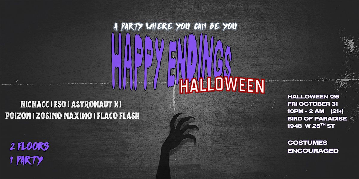 Our monthly dance party, Happy Endings, makes its way back to W 25th at Bird of Paradise on Halloween night! This Halloween, we're taking over the whole building for a two floor Halloween party! For this special Halloween night, the music will keep you dancing from the moment you walk in until you get downstairs. No better way to celebrate going into the Fall season than to throw a HUGE Halloween party! Beautiful people, eclectic DJ sets, visuals and lighting and dancing all night at Bird of Paradise! Created intentionally as a space where you can be you and let go.